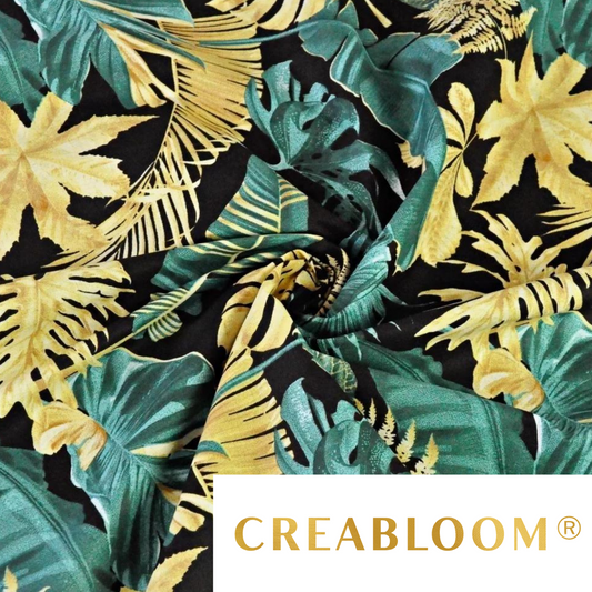 Tissu coton Motif dinosaures verts et marron avec un volcan sur fond écru