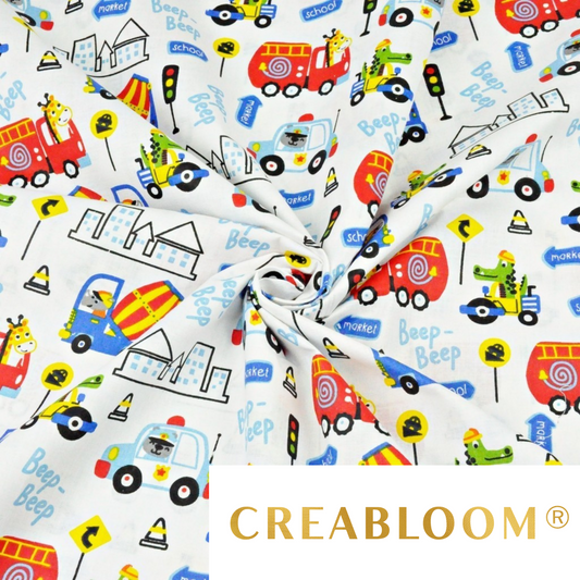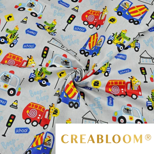 Baumwollstoff mit Fahrzeug- und Tiermuster
