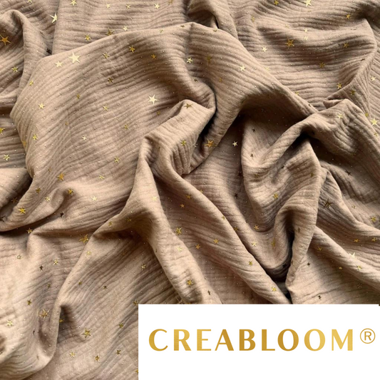 hellbrauner Double-Gaze-Stoff mit goldenen Sternen