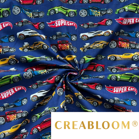 Tela de algodón con estampado de coches sobre fondo azul marino