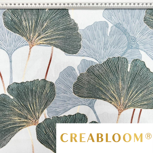 Tela de algodón estampada con pájaros y nubes sobre fondo beige.