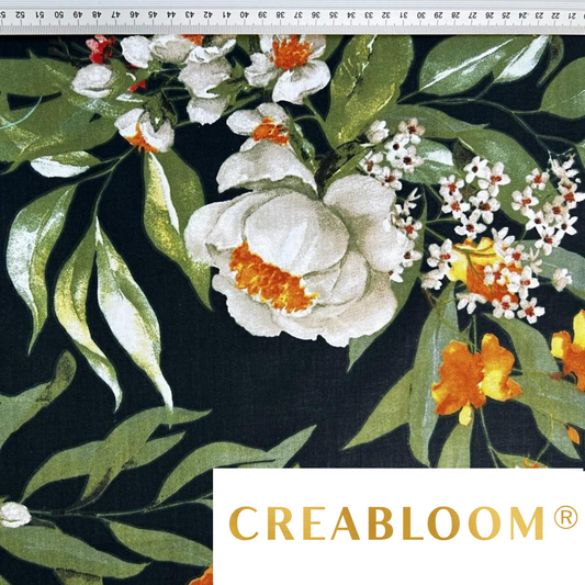 Tela de algodón con estampado de flores silvestres rojas y naranjas.